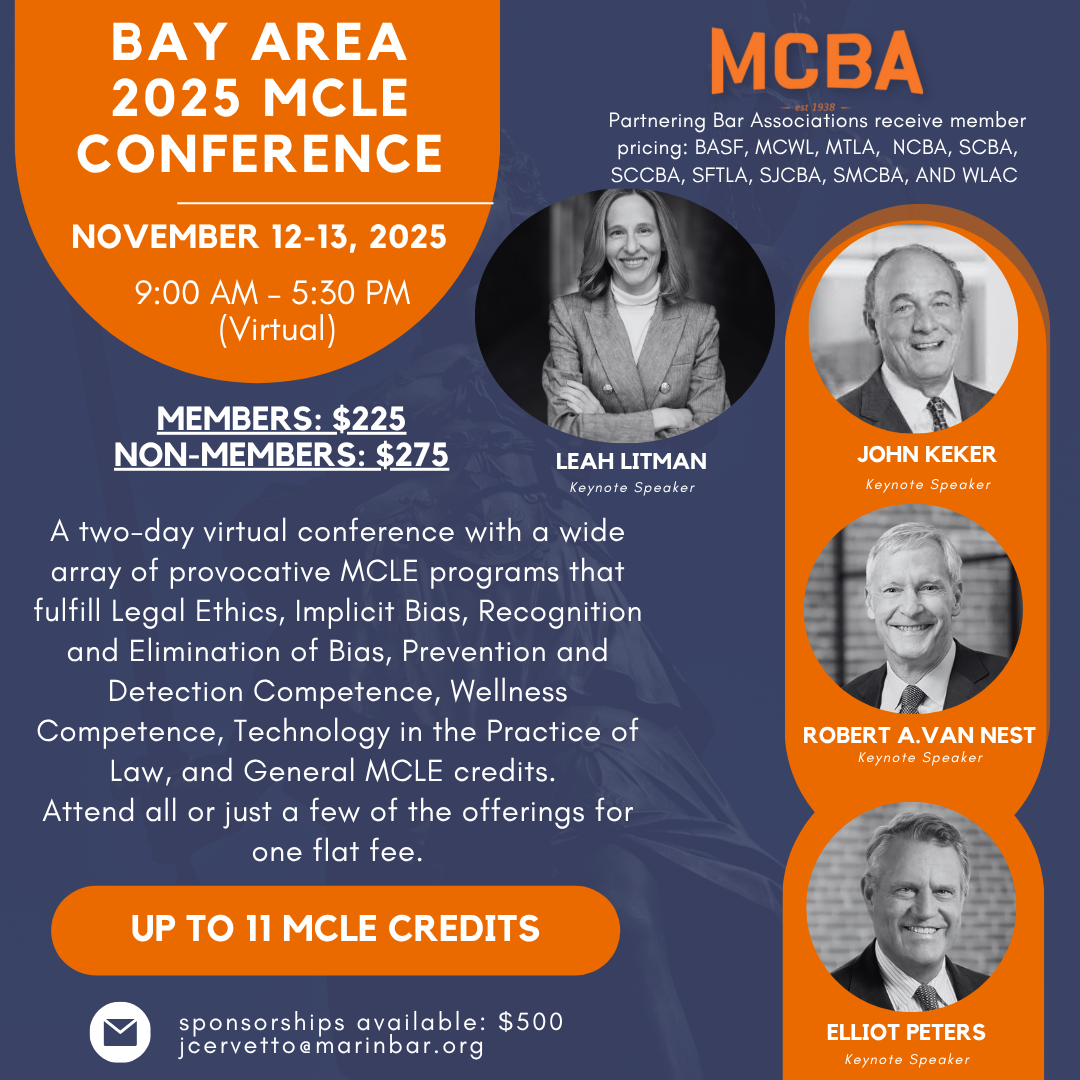 2025 Bay Area MCLE Conference Back to Search 2025 Bay Area MCLE Conference 11/12/2025 - 11/13/2025 Description Please use the below link to register:https://marinbar.org/events/?type=event&id=662 Additional Info × Via Zoom Event Contact Stephanie Carman Send Email 11/12/2025 - 11/13/2025 Registered Guests × Share × Print Email Add to Calendar Facebook LinkedIn X Pinterest Powered By GrowthZone