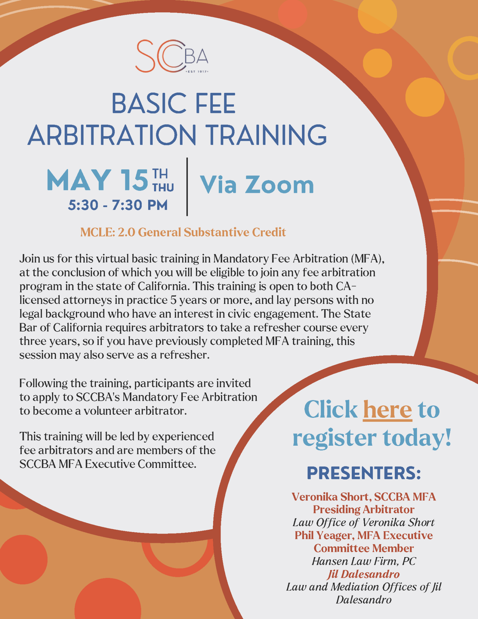 Following the training, participants are invited to apply to SCCBA's Mandatory Fee Arbitration to become a volunteer arbitrator.