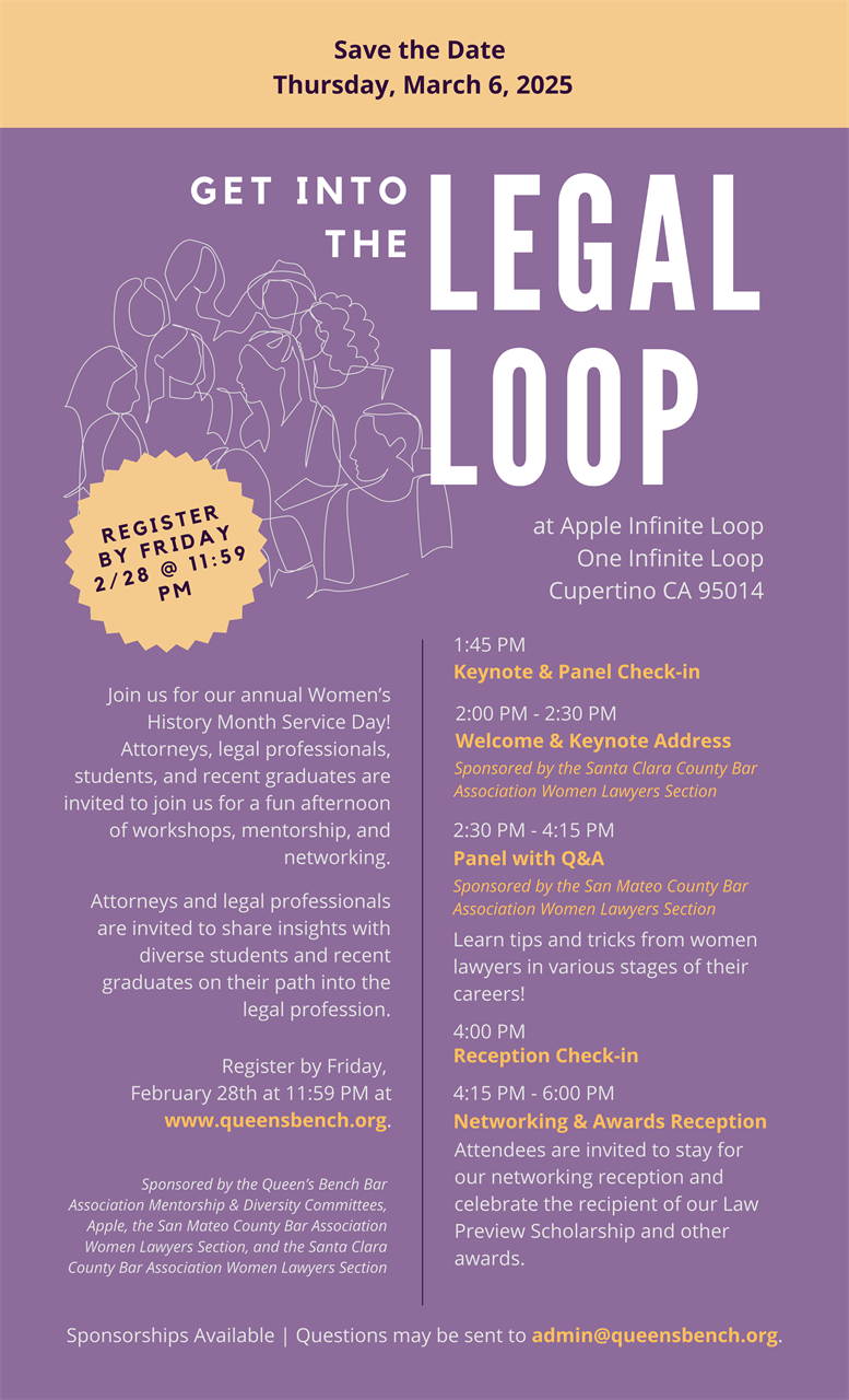 Celebrate Women's History Month and attend Get Into the Legal Loop, an event hosted by Queen's Bench Bar Association with Santa Clara County Superior Court Judge Manassau as the keynote speaker. Attorneys are encouraged to attend the reception to network and offer guidance to first year law students.