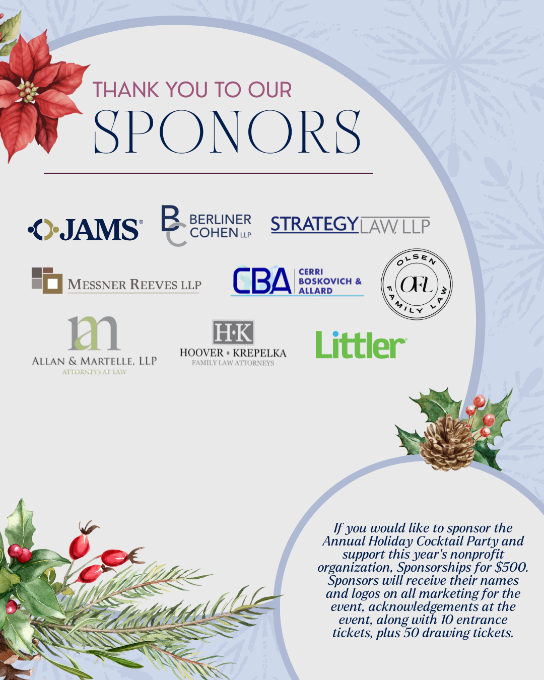 This year the Women Lawyer’s Section of the SCCBA will be hosting a holiday cocktail party with hors d’oeuvres, Wednesday, Dec. 10th, 5:30-7:30 pm on the lovely 4th Floor patio at Berliner Cohen.